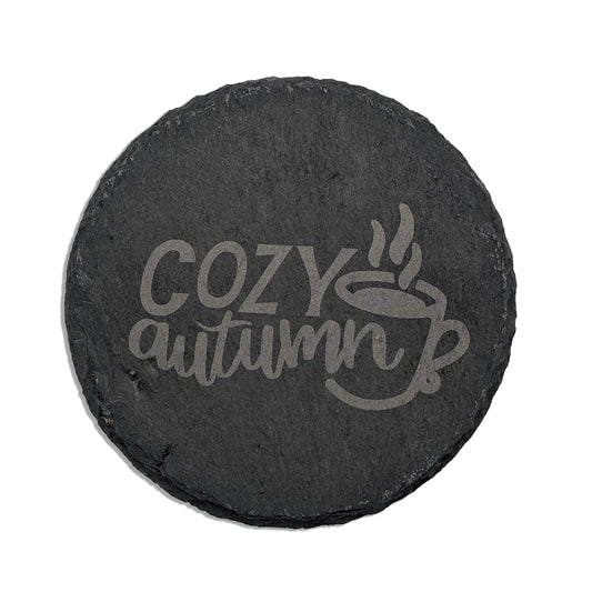 Autumn Elegance Square Slate Coaster Set - 'Cozy Autumn' Laser Engraved with Coffee Background (4 Pieces)