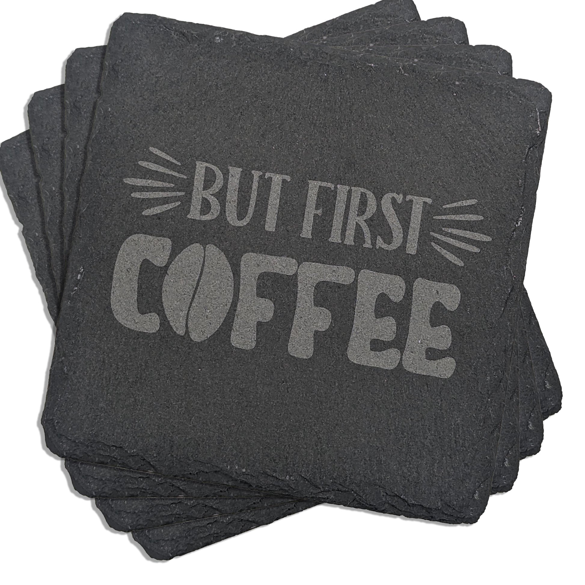 Caffeine Bliss Square Slate Coaster Set - 'But First Coffee' Laser Engraved with Bean Accent (4 Pieces)